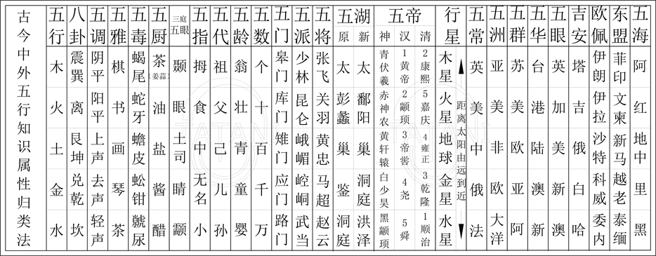 如:1、九大行星:我們也是按這五行的順序命名的,以太陽為根據:由遠到那近,分別是冥王星(被除名)、海王星、天王星、土星,木星、火星、地球、金星、水星、(如果只算五個的話)順序就和五行一樣了,多出來的是海天陸(土)所以個人覺得,冥王星(迷信)沒了,土星可以改名地王星;正好三皇五帝,開玩笑的; 2、五大常任理事國:1英國(草頭)木,央曾統領過世界;2美國(火)拆羊大,形像火,英生美;3中國C位、中為土,曾為世界中心;4俄國:人我為義,義講的是金;5法國:(水旁)水,土也是中,但不落地,差點統領過世界; 3、五眼:英(木)、加(添火)、美(實際中心,拆字:王大生角--魔王)、新西蘭(斤同金,西也是金)、澳(水邊); 4、吉安組織:1塔土旁但實力不夠,退為草頭,所以不聽話;2吉為士口,與火沒太大關系,但所不理事,3俄為中心(主義、主拼)4白(金)5哈口旁(為水)、6亞美尼亞太。ㄒ彩秋w地,所以不算;)所以集安結織很難行動一致。 5、五華:臺(藍轉綠)、香港(簡稱港)、陸(中)、澳、缺一,五行不全,所以并不穩定;現新加入海南,成四海,五行:1木(香港)2火(海南)3土(大陸)、4金(臺金不明顯,只要化金,或者以釣魚臺;白色政黨上臺,金配屬姓名的領導人,就很容易回歸)、5水(澳門); 6、東盟主不配位更亂、歐配克沙特,好一點只有他配主位:五海中阿拉伯就位海不明顯,如果修正去阿拉伯海,換為波斯灣,那黑;虿ㄋ篂尘蜁环定;